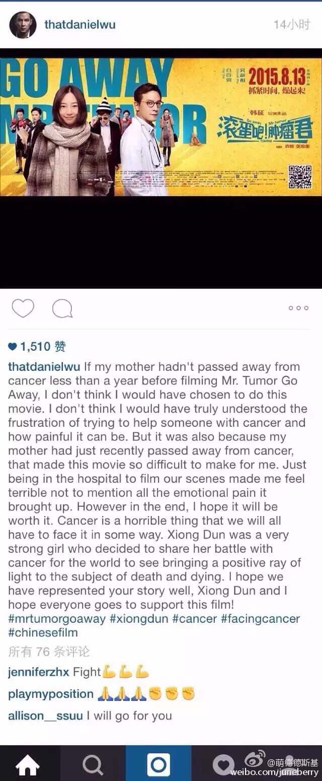 去年母亲因为大肠癌病重,吴彦祖更是举家回到美国,暂停了手头上的所有工作,半隐退娱乐圈。这一年来,递到他手上的剧本不计其数,但电影他只选择了一部,就是8月13日上映的《肿瘤君》,接下片约还是因为妈妈本身就是患癌去世,他希望通过这部电影来纪念妈妈。这也是我们今年可以在大银幕上看到他的唯一一部电影。他还专门发了个INS: