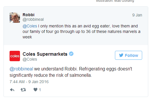 Coles回复说:我们理解,但是冷藏鸡蛋并不能很大程度降低沙门菌的风险。