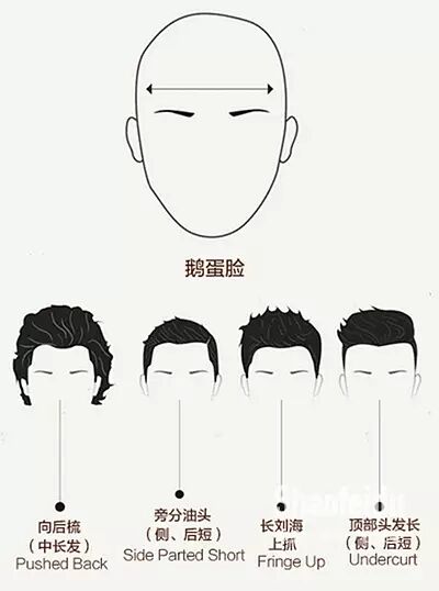 前额饱满,下颚圆润,下巴略尖,是的,这就是一张鹅蛋脸的标准配置。天生鹅蛋脸的直男们只需将额前的头发后梳或旁梳,就能将你匀称的脸型完全亮出来。