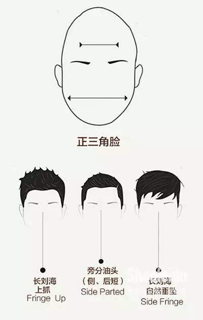 正三角形脸的额头较窄、脸颊较宽,上梳刘海和侧分线油头固然是最安全的。而有分量、有刘海的发型,也可以起到增加额头的宽度、修饰脸型的效果。